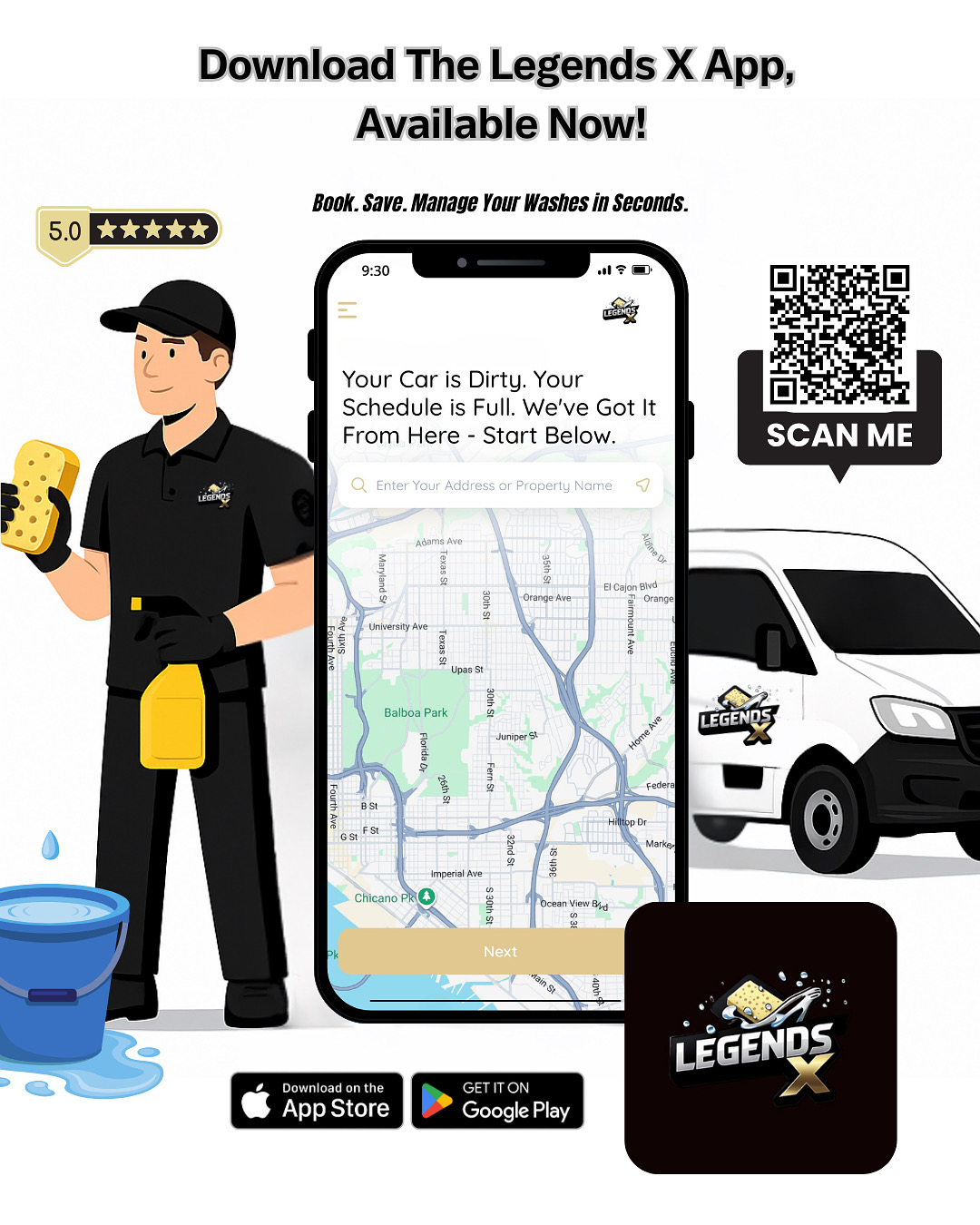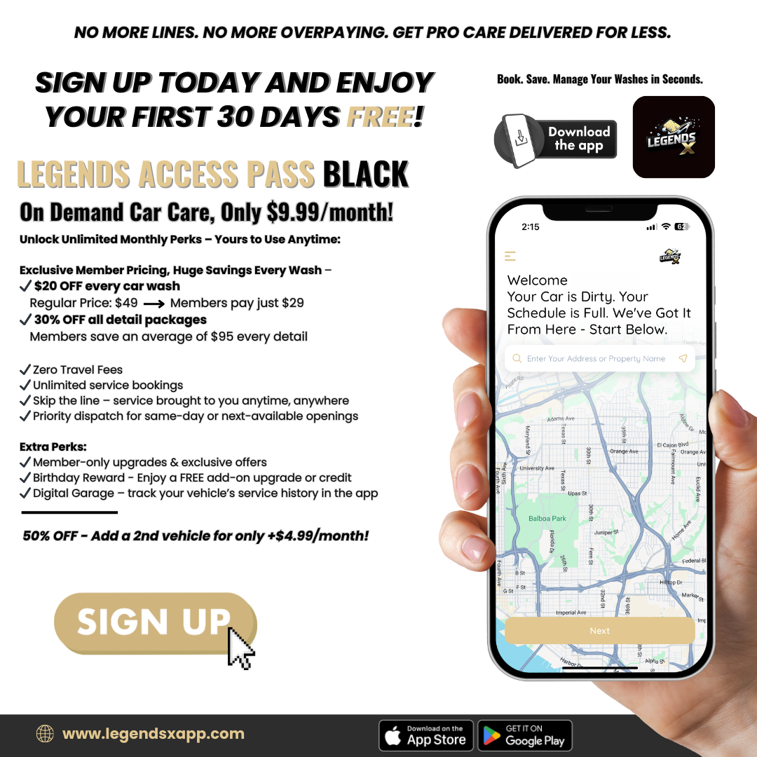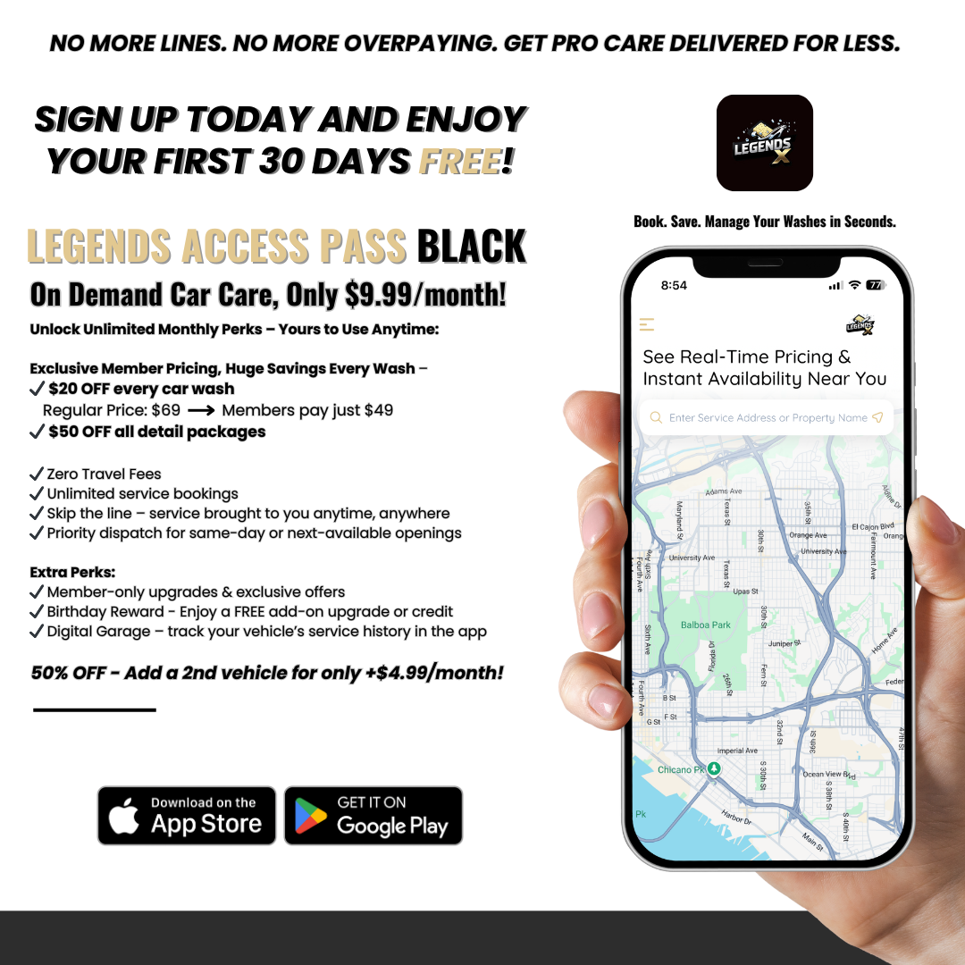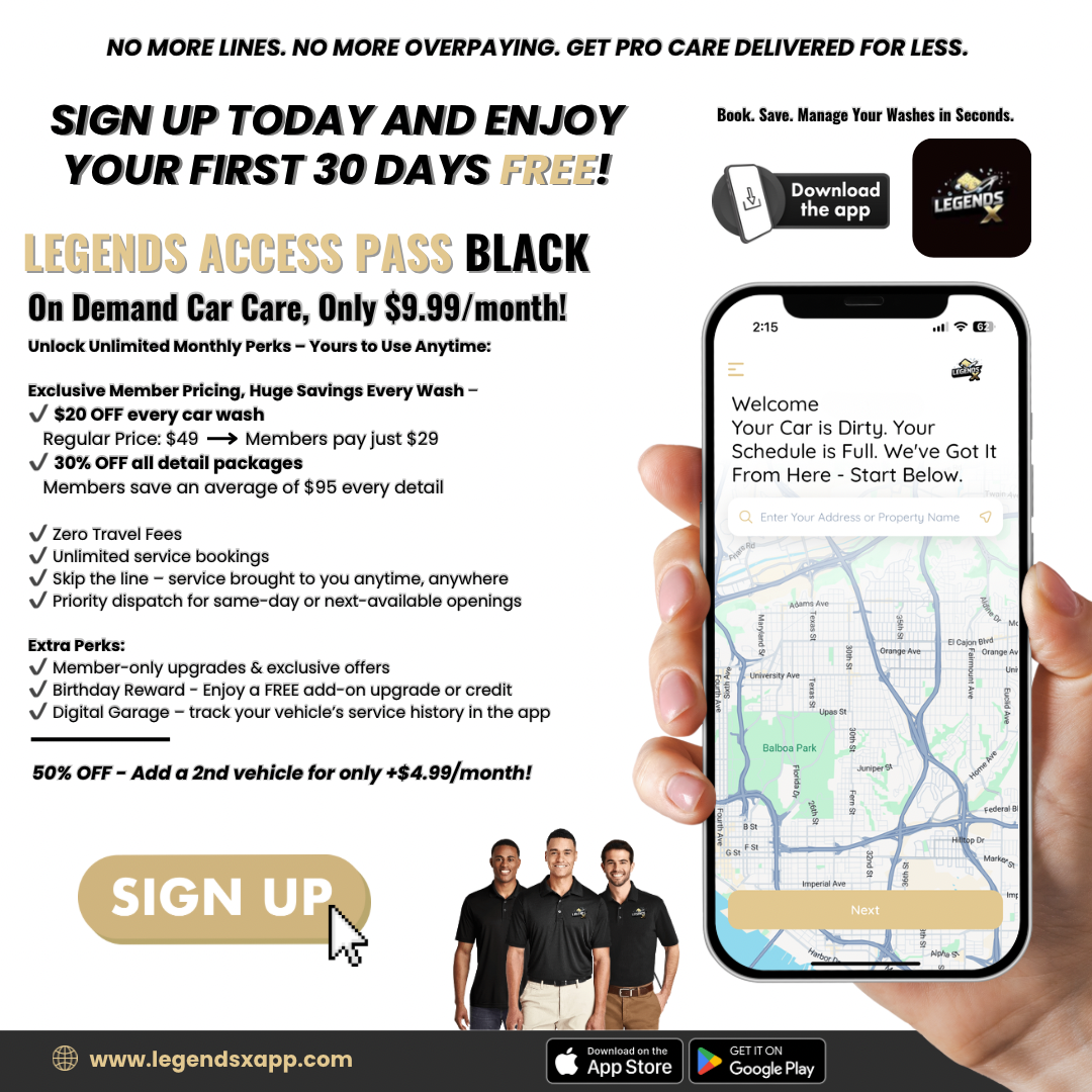Legends X makes vehicle care as easy as ordering food or groceries. With a few taps, you can book professional car care anytime, anywhere, delivered straight to your driveway or office.